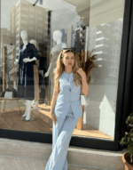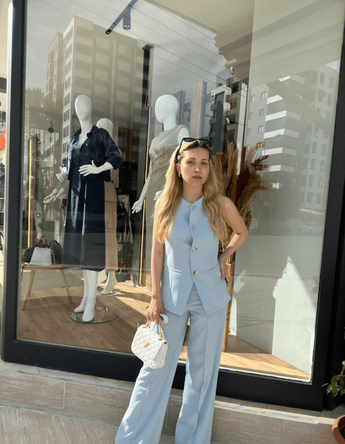 Zarafeti ve modern dokunuşları bir arada keşfetmek için bebe mavisi önü düğmeli yelekli pantolon takım tam size göre! ✨💙