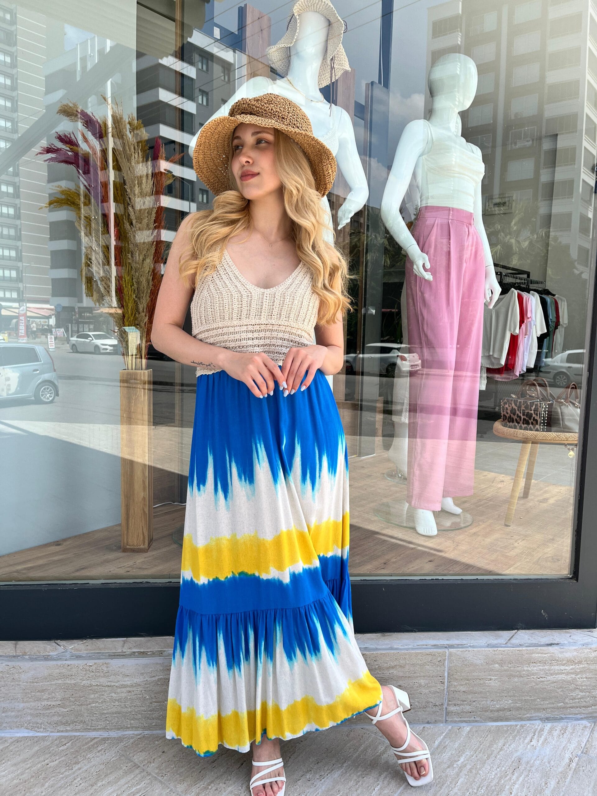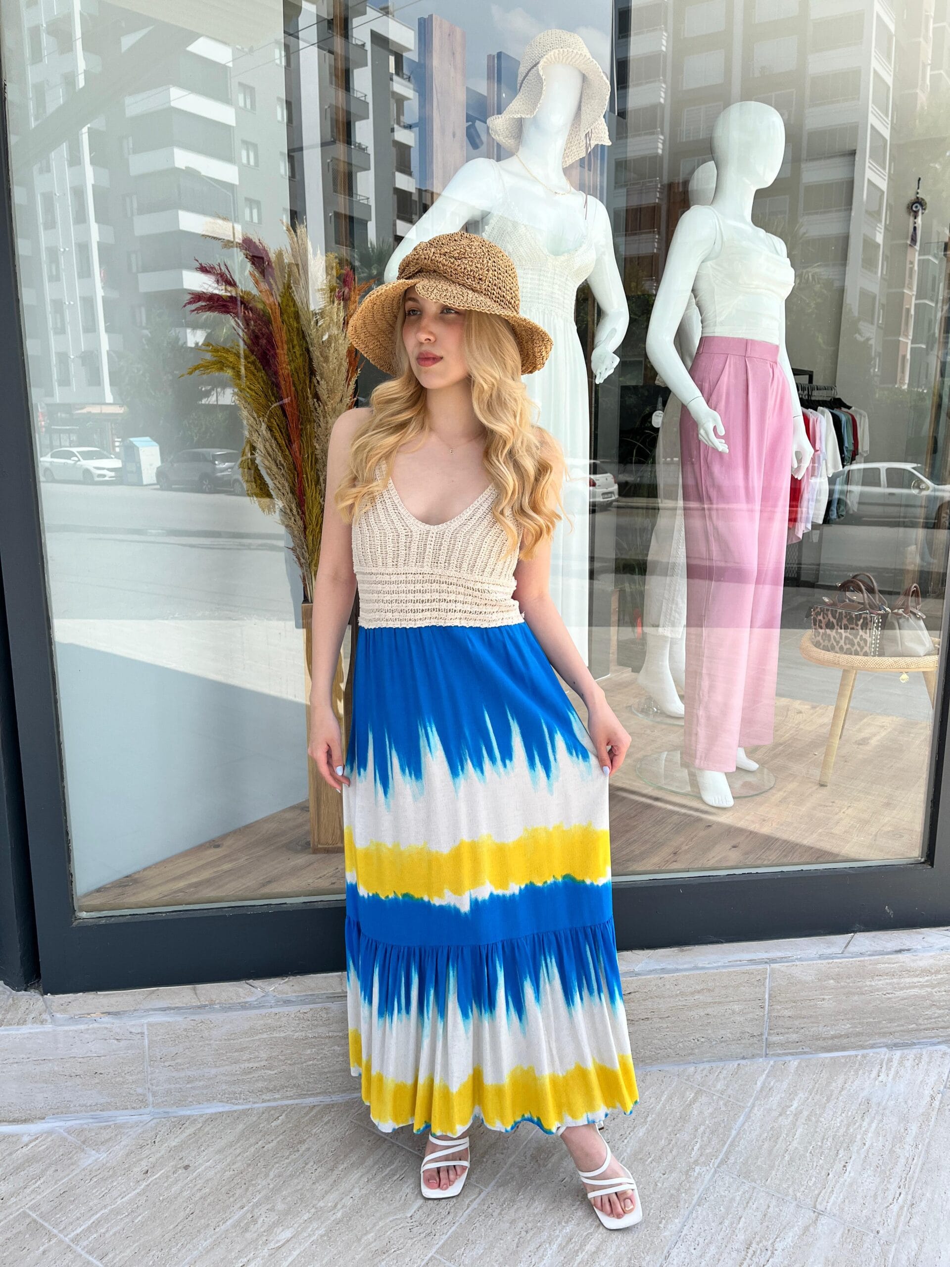 Yaz enerjisini taşıyan bu uzun elbise, üst kısmındaki kroşe dokusu ve alt kısmındaki mavi-sarı-beyaz batik desenli katmanlı etek tasarımıyla dikkat çekiyor. Kolsuz yapısı ve hafif kumaşı sayesinde sıcak havalarda ferah bir kullanım sunarken, hasır şapka ve sandaletle tamamlanan görünümle şehirde ya da tatilde stil sahibi bir duruş sergiliyor.