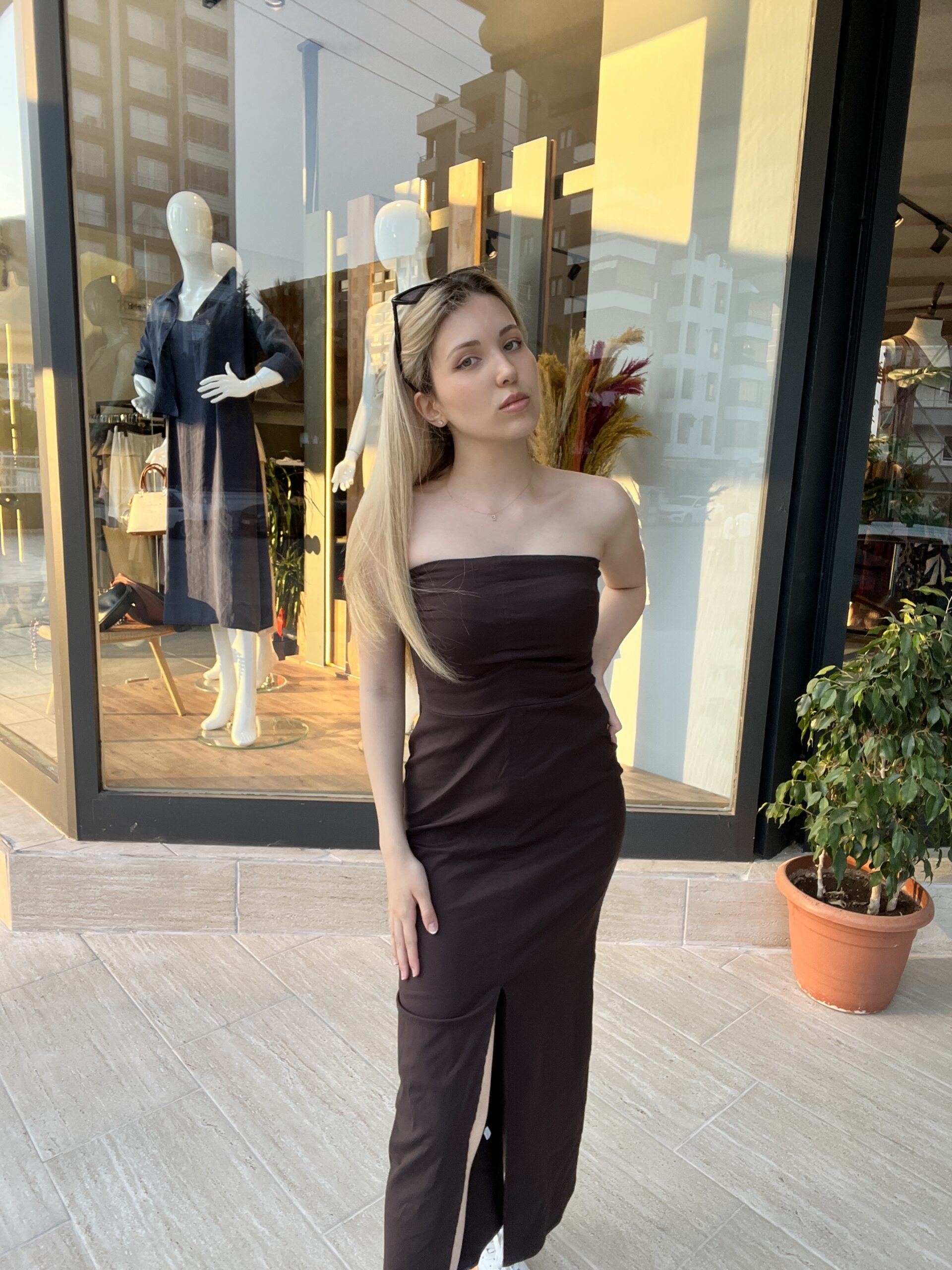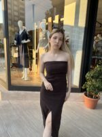 Elbisemizin en çarpıcı özelliği, zarif yırtmaç detayıdır. Şüphesiz, bu detay, bacağınızın doğal güzelliğini ortaya çıkarır. Yırtmaç, her adımınızda size eşlik eden akıcı bir siluet yaratır. Üstelik, modern ve çekici bir hava da katar. Klasik kahverengi rengi, zamansız bir şıklık sunar. Böylece, farklı aksesuar ve ayakkabılarla kolayca kombinleme imkanı verir. İster altın rengi takılarla lüks bir görünüm yaratın, ister sade aksesuarlarla minimal bir stil seçin. Sonuç olarak, bu yırtmaçlı elbise her türlü kombine uyum sağlar.