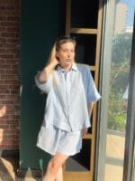 Bu takım, yaz mevsiminin ferahlığını doğal keten kumaşla harmanlayarak sofistike bir görünüm sunuyor. Gömlek kısmının salaş kesimi, hem şehir hem tatil stiline uyum sağlarken, diz hizasında biten şort parçası hareket özgürlüğü veriyor. Rengiyle romantik ve sade bir enerji yansıtan takım, hem rahatlık hem zarafet arayanlar için ideal. Düğme detayları, tasarıma klasik bir dokunuş katarken; ketenin nefes alabilir yapısı sıcak günlerde konforu artırıyor. Gündüz hasır şapkayla sahil yürüyüşüne, akşam minimal takılarla şehir akşamına kolayca adapte olan parça, markanın zamansız ve işlevsel çizgisini vurguluyor.